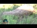 Because of its relatively large size, the giant pangolin is particularly well-suited to breaking open termite mounds, done by leaning on the mound and resting its weight on its tail, and then ripping into the mound with its front claws. The combination of weight and physical damage quickly leads to a partial collapse of the mound, exposing the termites. It eats the insects by picking them up with its sticky tongue, which is up to 16 inches long. Only the adults are strong enough to do this, their young having to follow behind their mothers, until they grow large enough to do it for themselves.